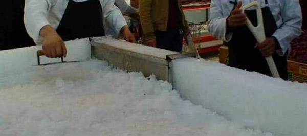 3. 把冰模放在冰臺邊沿,向冰模內注冰,邊注冰邊打實。冰模注滿冰以后,用模板放在上面用錘拍打,直到打實為止